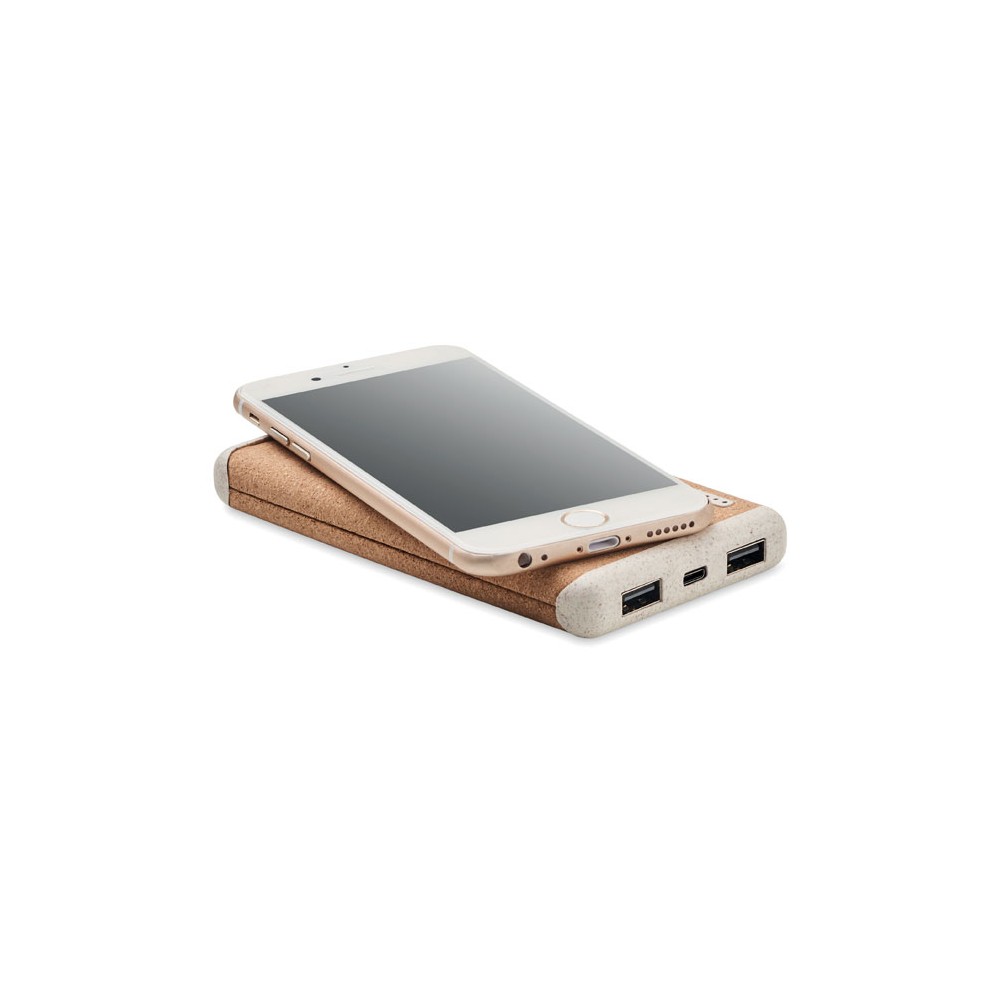 Powerbank en liège avec entrée/sortie type C. Prise en charge de la technologie Power Delivery. Ce chargeur est équipé d’une batterie Li-ion Polymère (10000mAh) et d'une technologie de recharge sans fil (10W).